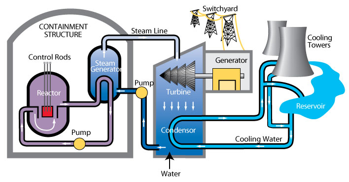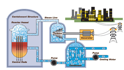 Pada penggunaan tenaga nuklir, sistem kondensor mereka membuang energi panas. Jumlah energi panas tersebut bervariasi tergantung dari komponen yang digunakan pada pembangkit tersebut. Namun pada umumnya, ada sekitar 60% – 70% energi panas dikeluarkan dari penggunaan energi nuklir. Beberapa pembangkit listrik, mengunakan cooling towers dan sebagian lain menggunakan air dalam jumlah yang banyak, seperti danau buatan atau danau dan sungai alami. [AdSense-B]